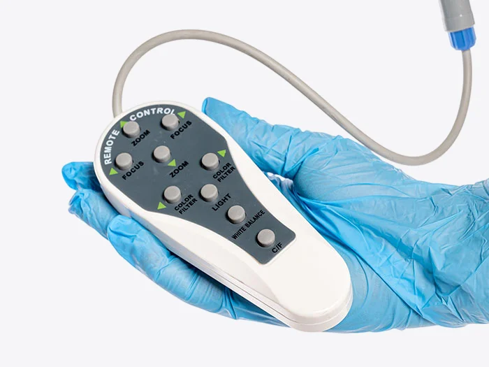 Эргономичный проводной пульт, подключаемый непосредственно к оптической головке, дает быстрый доступ к основным функциям: регулировке увеличения, сдвигу точки фокуса, управлению цветовыми фильтрами и моментальной фотофиксации. Для полного соблюдения стерильности и удобства опционально доступен ножной переключатель. Он позволяет освободить руки врача для проведения манипуляций.