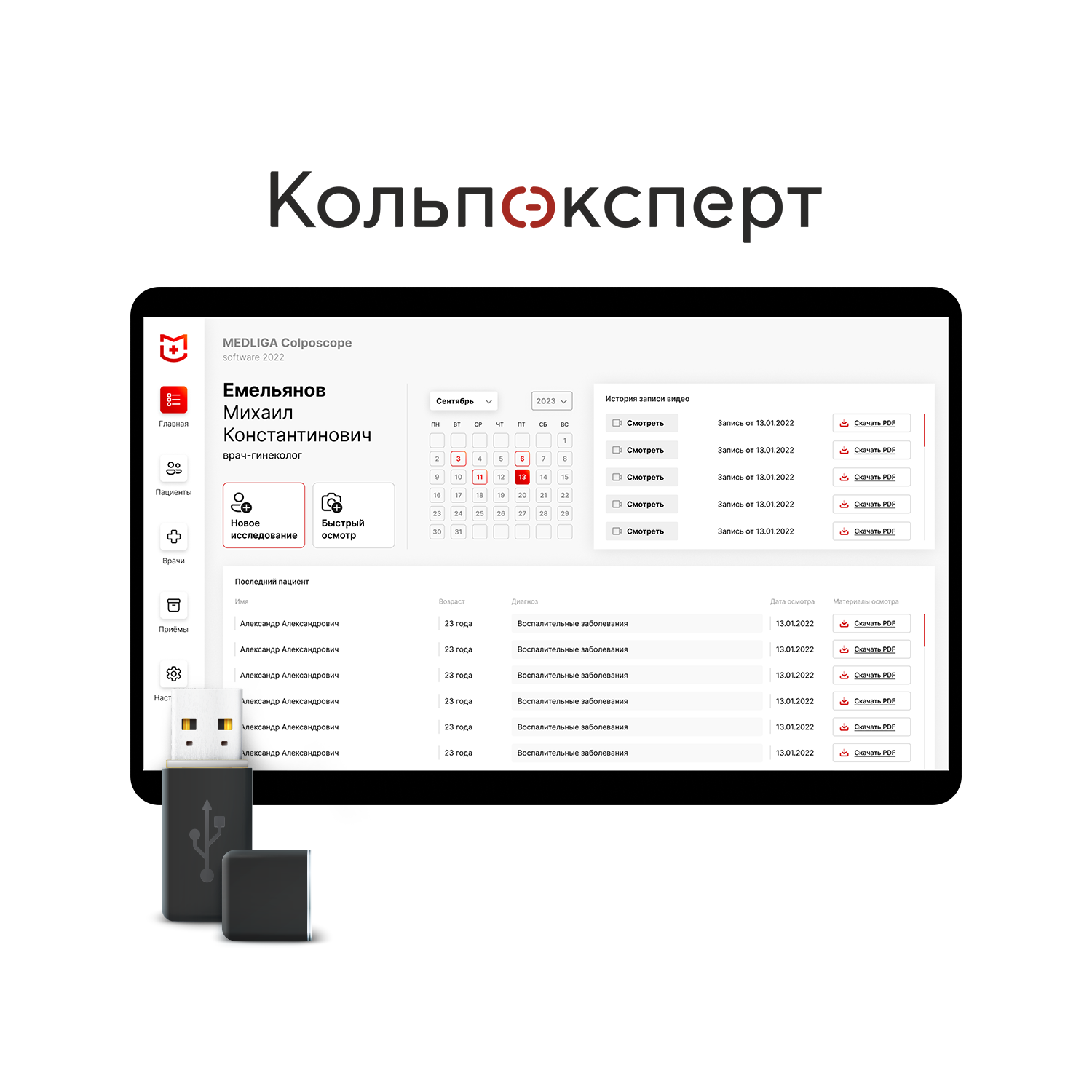 Интеграция с ПО «Кольпоэксперт» даёт возможность вести реестр осмотров, протоколы, фото и видеодокументацию, а также просматривать динамику состояний в рамках диспансерного наблюдения. Сбор анамнеза до кольпоскопии по стандартам ASCCP. Заключение по классификации Рио-де-Жанейро. Интеграция с медицинскими информационными системами (МИС).