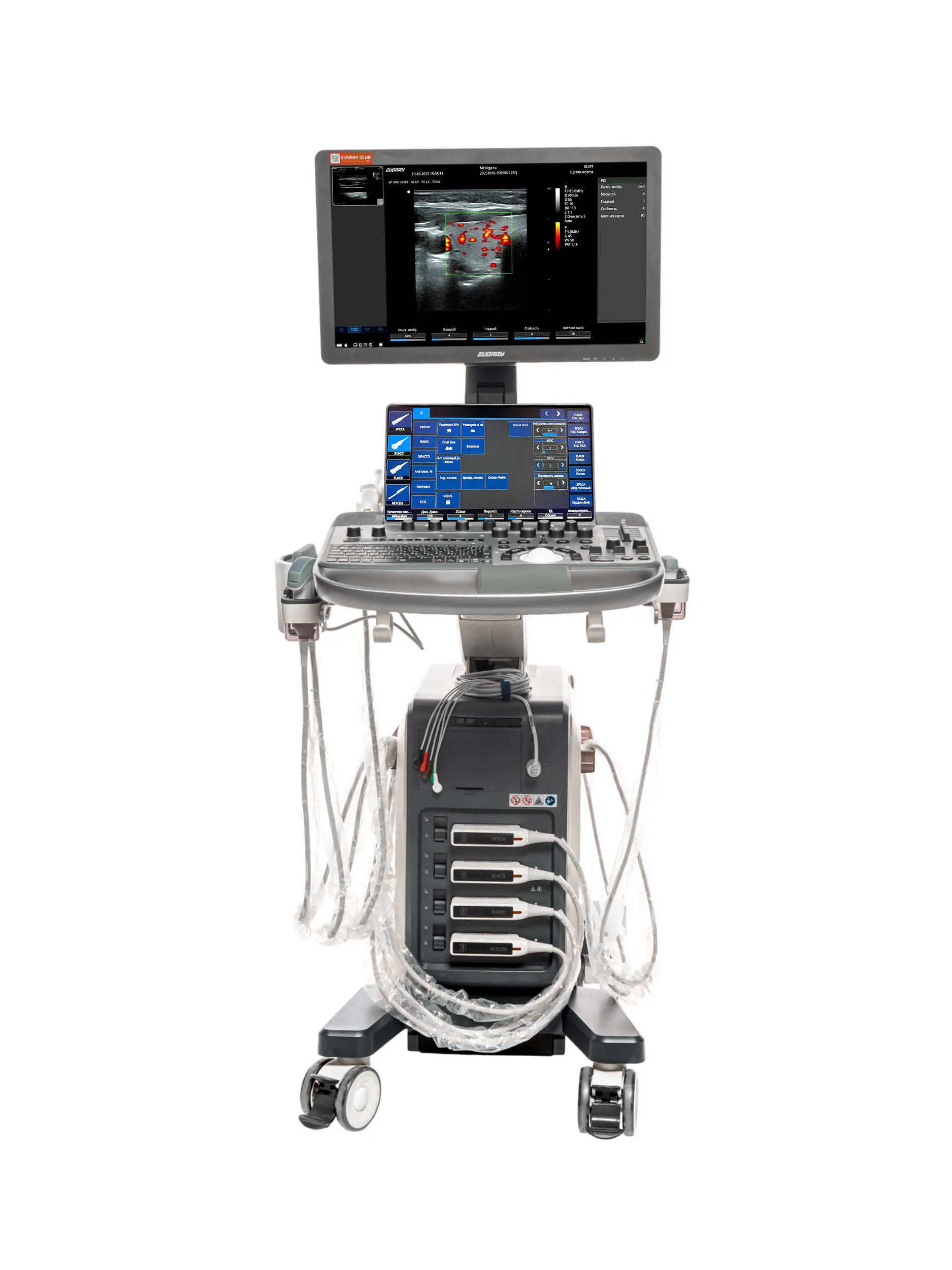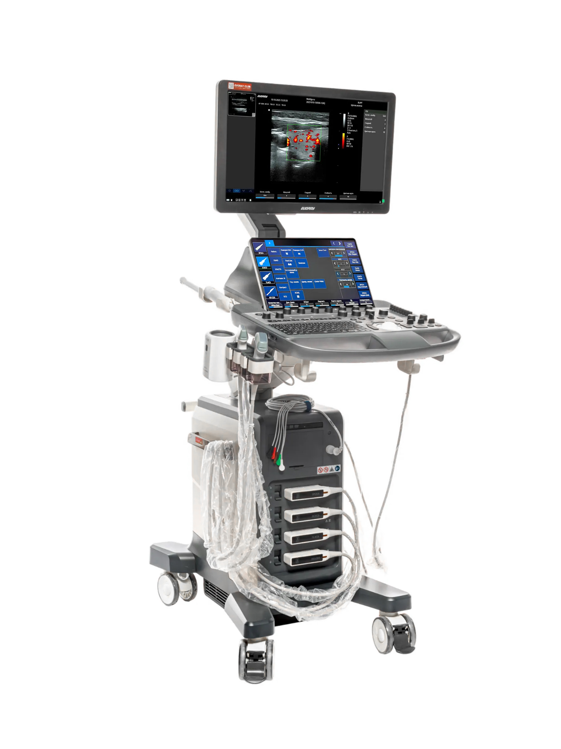Стационарная архитектура EVORAY USS 60 предусматривает одновременное подключение до четырёх датчиков. Система совместима с широкополосными многочастотными датчиками: